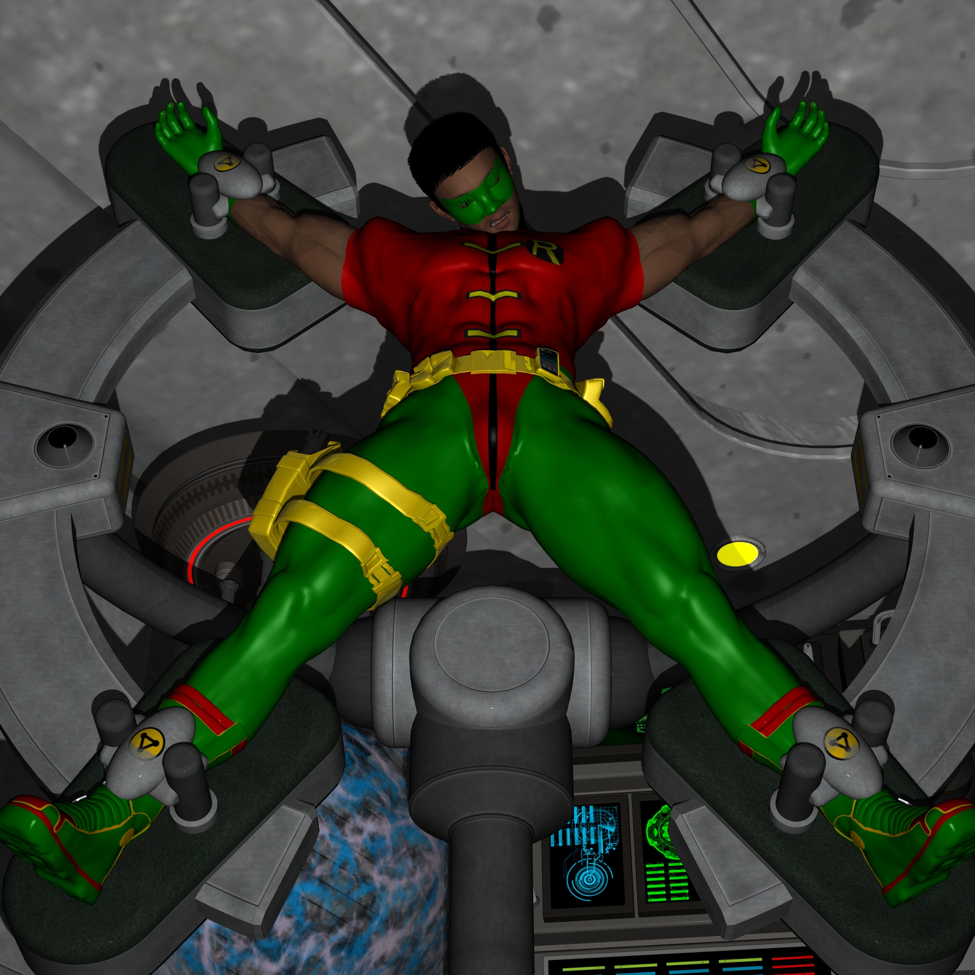 The villain pushed a couple button on the control panel and a round ring table of sorts moved into a vertical position. Once it stopped he picked up the hero, beginning to strap him onto the table by the wrists and ankles. It didn’t take long to get him secured to the table. Once the pads were locked in place there was no way he would be getting g free unless he was released.